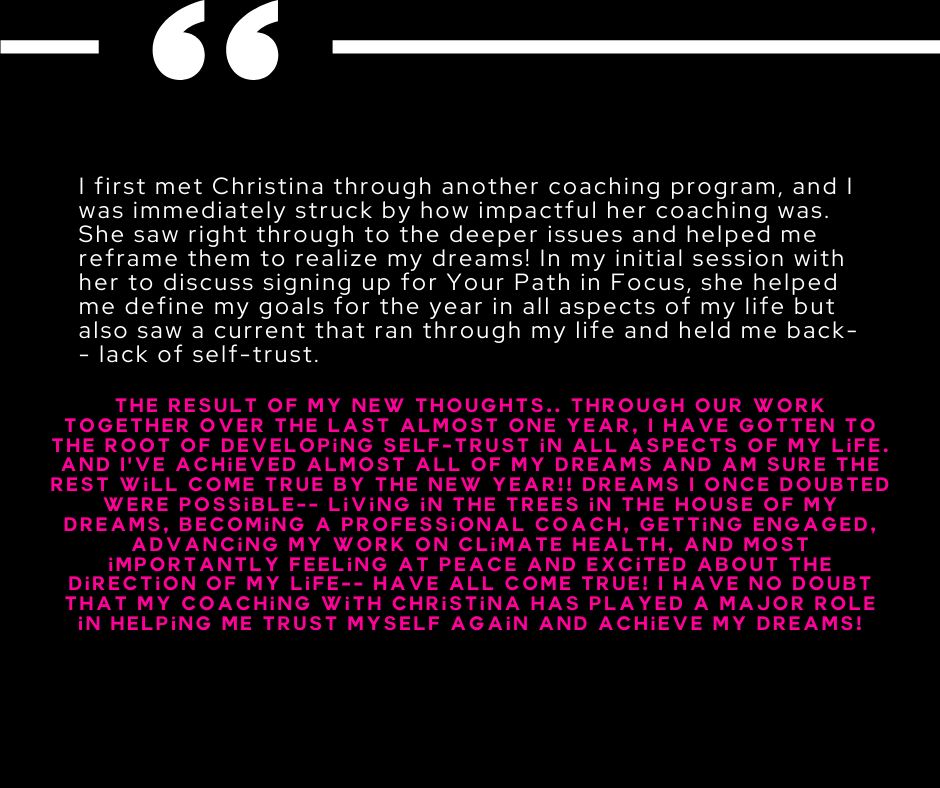 Honestly, I was VERY skeptical about coaching and if this process would work for me. I am SO glad that I stepped out of my comfort zone and invested in myself. This course works. Christina is amazing.