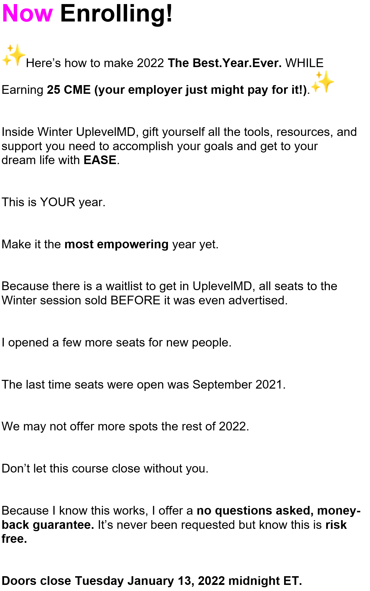 Fees - one time payment of $5,997, due before you will be granted access to the Program. You are responsible for your own results. If, for any reason, you are not satisfied within 30 days of the program start date, you are entitled to a full refund (less Paypal transaction fees) with no questions asked. Dr. Arnold is a doctor, but is not serving as your doctor through UplevelMD.
